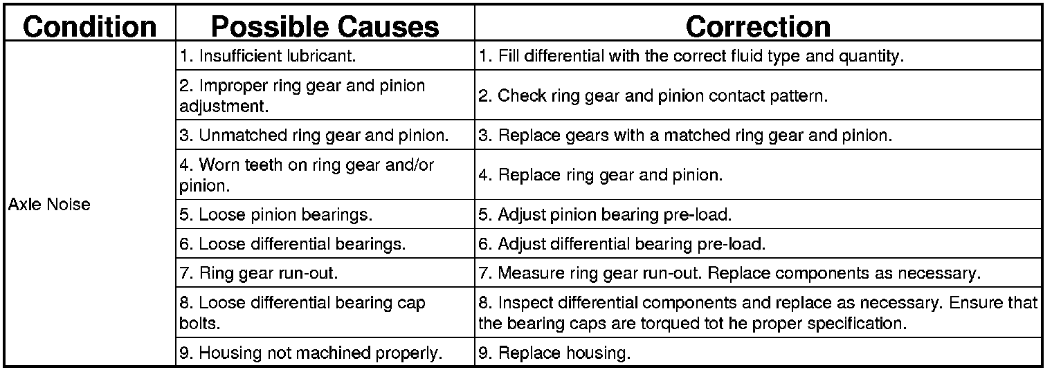 When road testing, first warm-up the axle fluid by driving the vehicle at least 5 miles and then accelerate the vehicle to the speed range where the noise is the greatest. Shift out-of-gear and coast through the peak-noise range. If the noise stops or changes greatly: