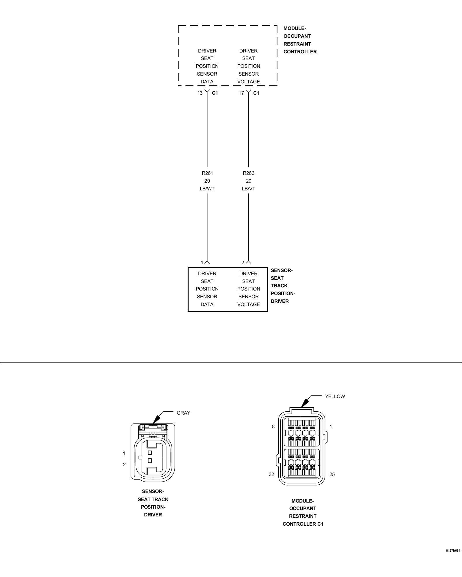 1. Measure the resistance between the (R261) Driver Seat Position Sensor Data circuit and the (R263) Driver Seat Position Sensor Voltage circuit in the Driver Seat Track Position Sensor connector.