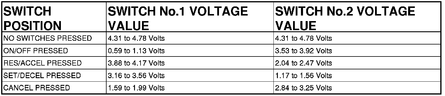 5. The following resistance specs are taken between terminals (V72) S/C Switch Sense 2 circuit and the (V937) Switch Return circuit of the switch when holding the switch button in the following position: