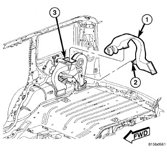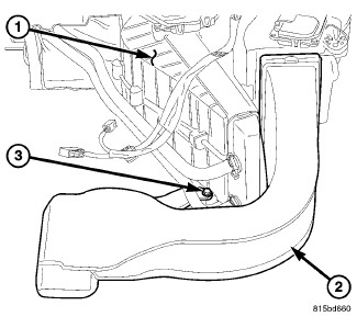 2. Install the screw (3) that secures the lower distribution duct to the rear HVAC housing. Tighten the screw to 2 Nm (17 in. lbs.).