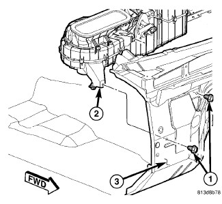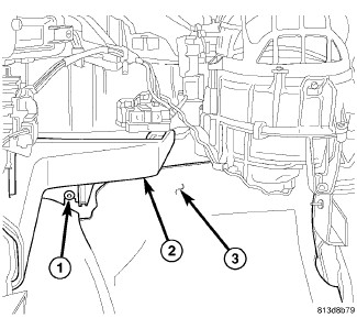 3. Install the two bolts (1) that secure the HVAC housing assembly (2) to the engine compartment side of the dash panel (3). Tighten the bolts to 7 Nm (62 in. lbs.).