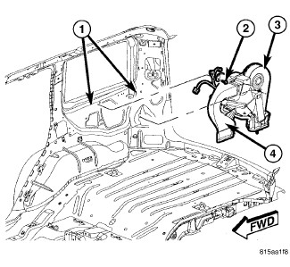 3. Install the one nut and one bolt (2) that secure the rear HVAC housing to the rear interior quarter panel (1). Tighten the fasteners to 3 Nm (27 in. lbs.).