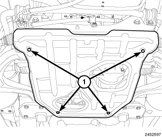 3. Position the lower splash shield and install the retaining bolts (1).