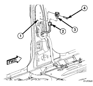 2. Install and tighten the screw (4) that secures the sensor to the inner B-pillar. Tighten the screw to 6.5 Nm (60 in. lbs.).