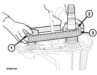 36. Install the front drive sprocket (1), mainshaft drive sprocket (2), and drive chain (3) as one.