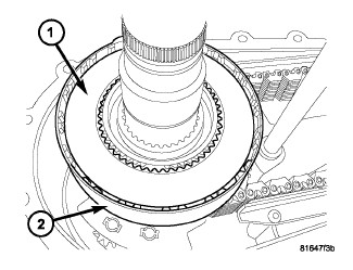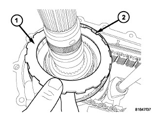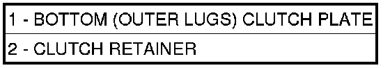 1. Install the bottom (outer lugs) clutch plate (1) into the clutch retainer (2). Continue installing clutch plates, a disc with inner teeth followed by a disc with outer lugs, into the clutch retainer (2).