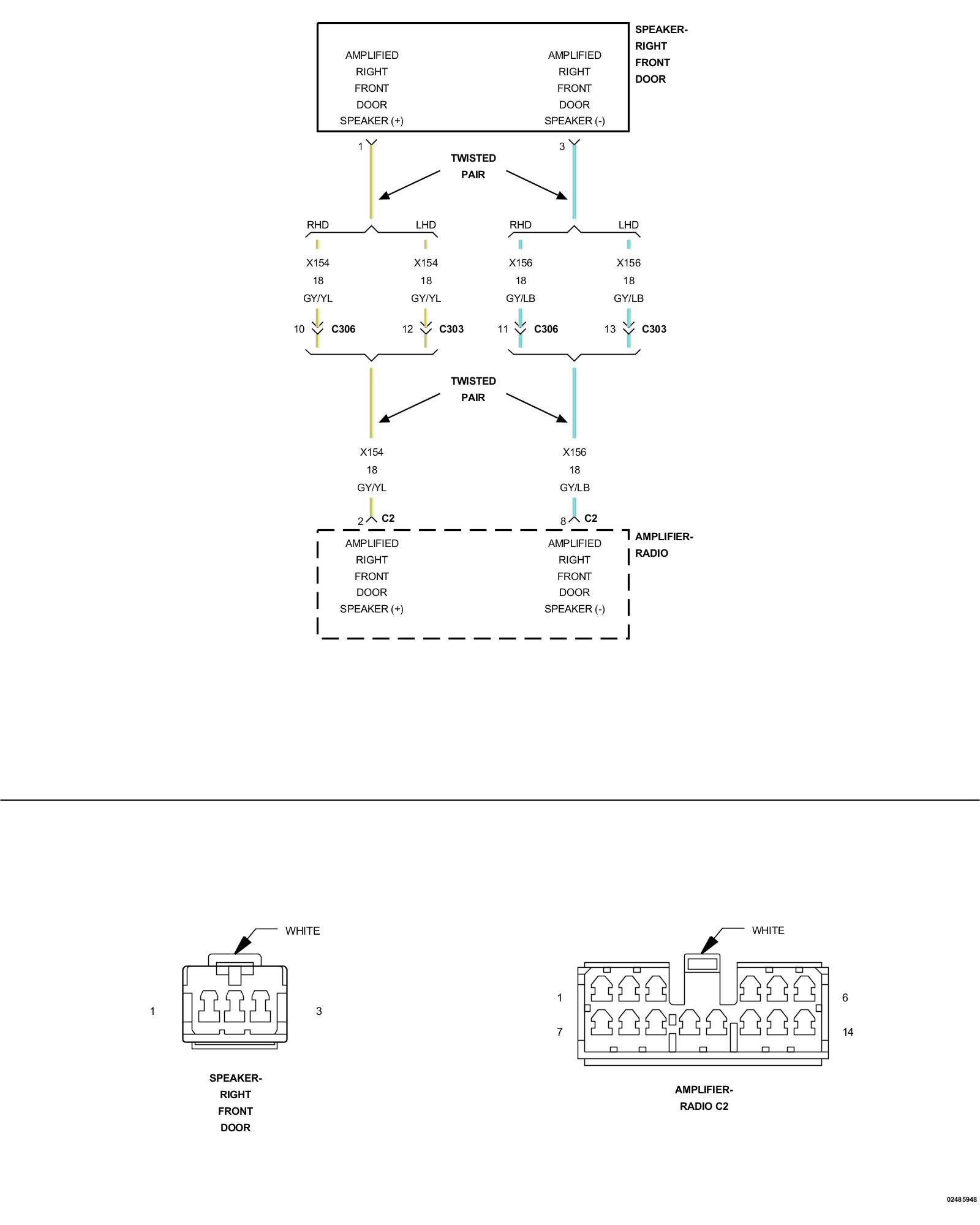 3. CHECK THE (X154) AMPLIFIED RIGHT FRONT DOOR SPEAKER (+) CIRCUIT FOR A SHORT TO GROUND