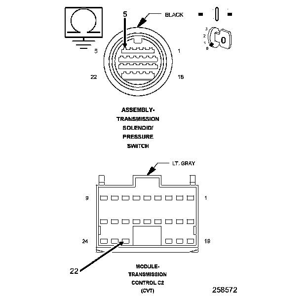 3. Measure the resistance of the (T72) 5-volt Supply circuit between the TCM C2 harness connector and the Transmission Solenoid/Pressure Switch Assembly harness connector.