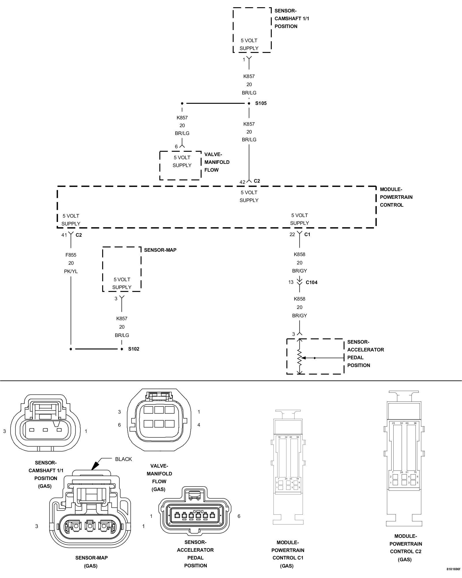 2. Inspect the (K857) 5 Volt Supply circuit between the Camshaft 1/1 Position Sensor harness connector and the PCM harness connector.