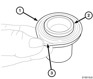 3. Position the dust boot over the top of the piston (2) and into the piston groove. Make sure the side of the dust boot with the outer lip (3) for the boot snap-ring is positioned upward as shown.