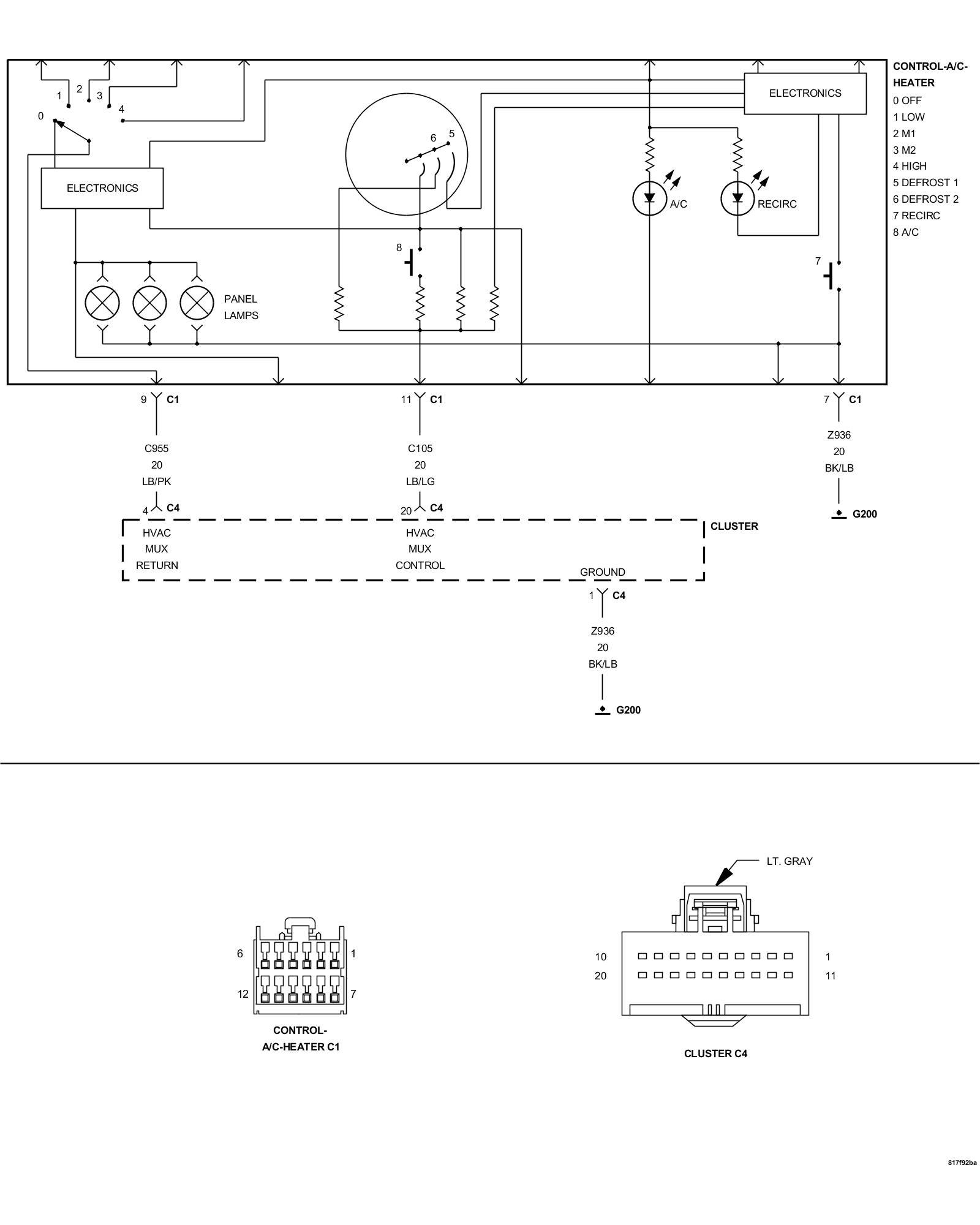 1. Measure the resistance between the (C105) HVAC MUX Control circuit and the (Z936) Ground circuit in the A/C Heater Control C1 harness connector.
