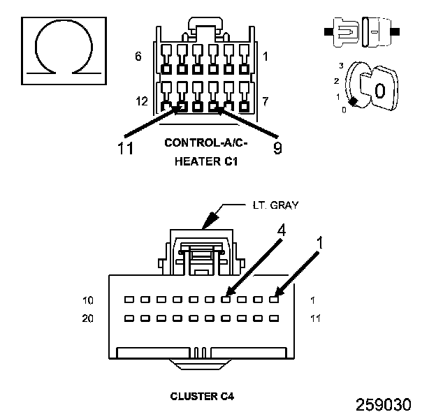 3. Measure the resistance of the (C105) HVAC MUX Control circuit between ground and the A/C Heater Control C4 harness connector.