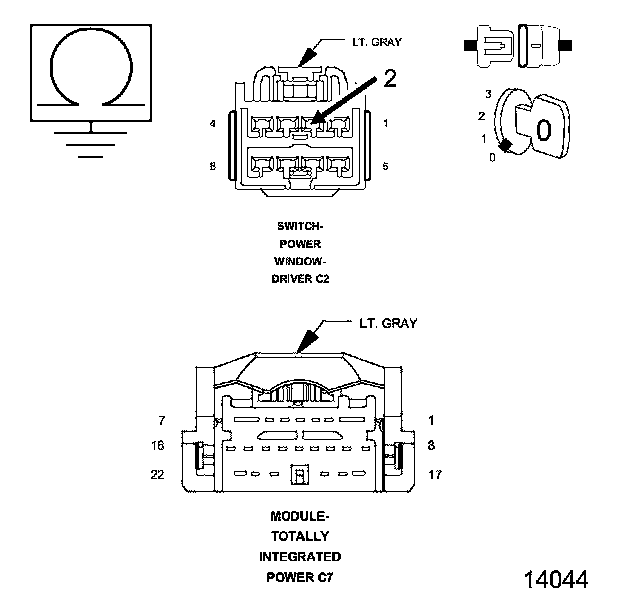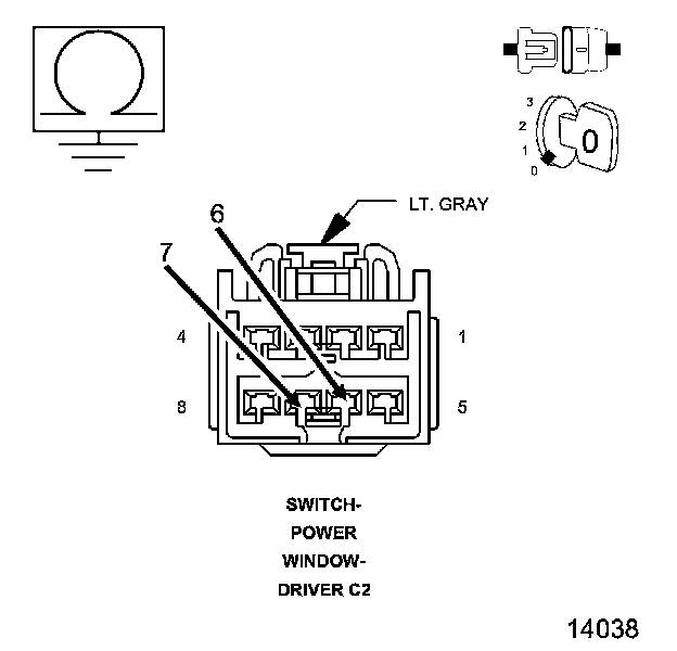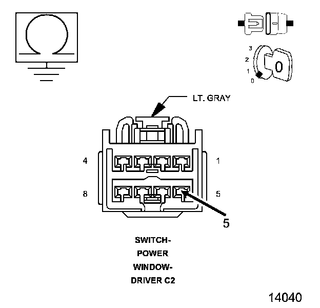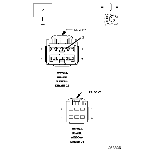 1. Measure the resistance between ground and the Front Window Driver (Up and Down) circuits in the Driver Window Switch C2 connector.