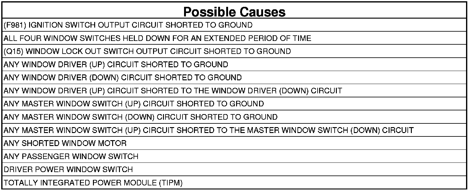 - Repair the (Q15) Window Lock Out Switch Output circuit for a short to ground. The short could be in any wire going to a Passenger Window Switch or in one of the Passenger Window Switches