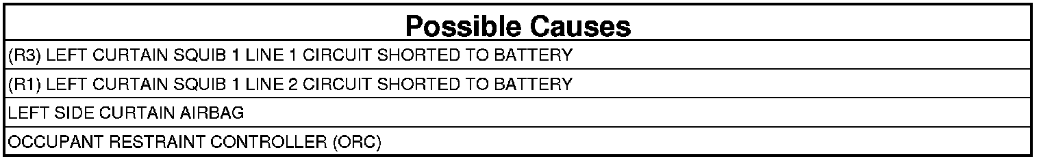 The Occupant Restraint Controller (ORC) monitors the voltage on the Left Curtain Squib 1 circuits. The ORC will set this DTC if it detects voltage on the Left Curtain Squib 1 circuits.