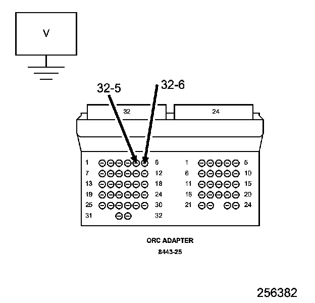 5. Measure the voltage of the (R1) Left Curtain Squib 1 Line 2 circuit between the ORC 8443-25 adaptor cavity 5 and ground.
