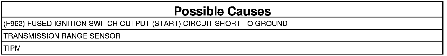 The TIPM detects a short to ground condition in the (F962) Fused Ignition Switch Output (Start) circuit.