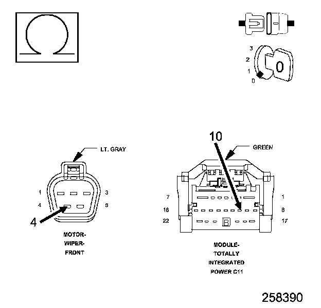 4. Using a 12-volt test light connected to ground, check the Fused Accessory Relay Output circuit in the Front Wiper Motor harness connector.