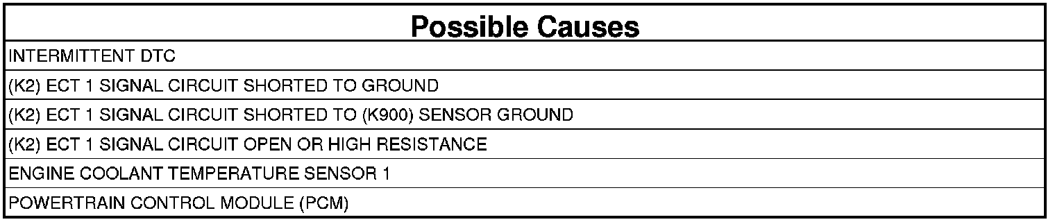 - Repair the (K2) ECT 1 Signal circuit for a short to the (K900) Sensor Ground circuit.