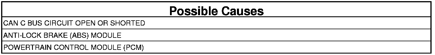 The PCM doesn't receive a vehicle speed signal from the Anti-Lock Brake Module over the CAN C bus.