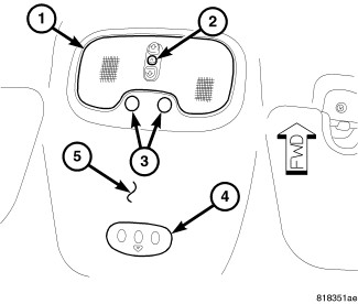 4. Working through the courtesy/reading lamp hole in the headliner, pull the universal transmitter module (1) forward and down through the headliner (2).