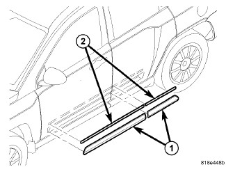 2. Remove protective cover from tape on back of molding (2). Apply molding to body below the masking tape guide.