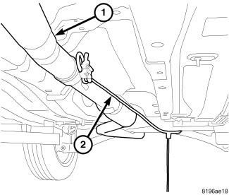 13. On FWD vehicles, remove strap (2) from exhaust pipe (1).