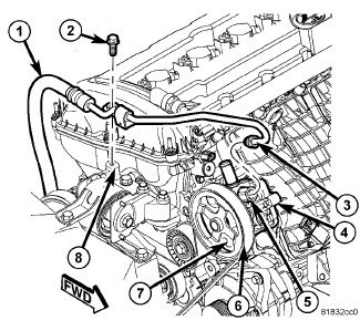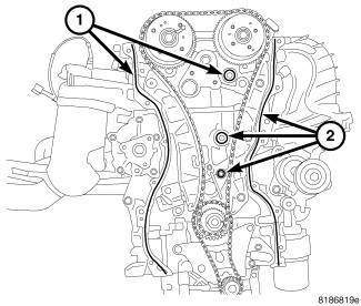 6. Apply 2 mm bead of Mopar(R) engine sealant RTV (or equivalent) to the engine block (1,2) as shown.