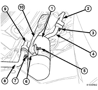 5. Install the retaining band (6) and bolt (5) that secure the A/C accumulator (1) to the mounting bracket. Tighten the bolt to 8 Nm (71 in. lbs.).