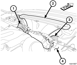 1. Position the defroster duct (2) into the top of the instrument panel (4).