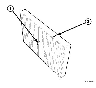The filter should be replaced at least once a year or every 24,000 km (15,000 miles) and checked if heating-A/C system performance seems lower than expected. The particulate air filter is labeled with an arrow (2) to indicate the direction of air flow through the filter.
