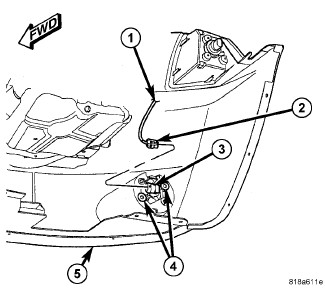 1. Position the front fog lamp into the seat in the face of the front fascia (5). Be certain that the two alignment pins on the back of the lamp housing are engaged in the alignment holes in the seat.