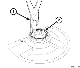 7. Install a NEW snap ring (2) in the knuckle using an appropriate pair of snap ring pliers (1). Make sure the snap ring is fully seated.
