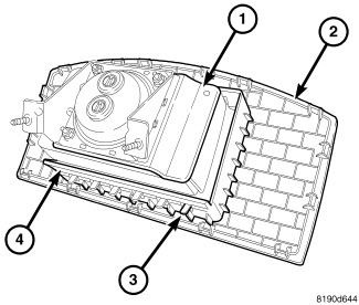 3. Work around the perimeter of the unit engaging each of the 12 hooks (3) on the passenger airbag housing through the 12 windows in the walls of the airbag door receptacle.