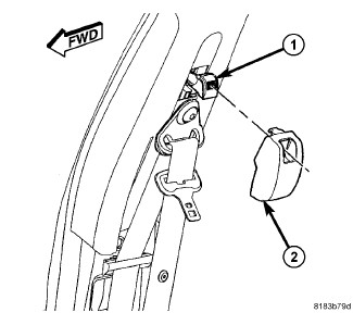 11. Insert the upper tab of the turning loop trim cover (2) into the slot in the height adjuster cover above the knob on the upper B-pillar, then roll the bottom of the cover down over the turning loop and use hand pressure to press firmly and evenly on the cover until it snaps into place.