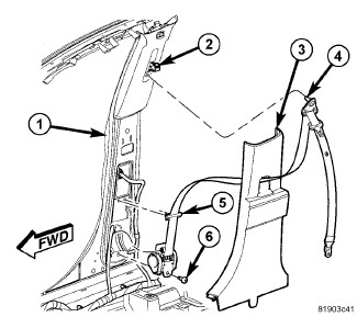 7. Route the front seat belt turning loop and lower anchor through the seat belt opening in the lower B-pillar trim (3).