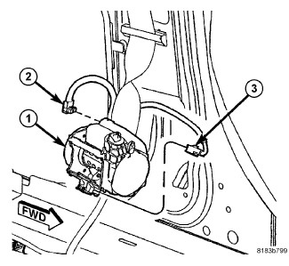 1. Position the seat belt and retractor (1) into the vehicle as a unit.