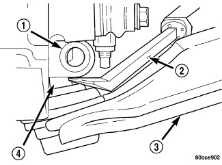 14. Using an appropriate prying tool (2), separate the ball joint stud (4) from the knuckle (1) by prying down on lower control arm (3) and up against the ball joint boss on the knuckle.