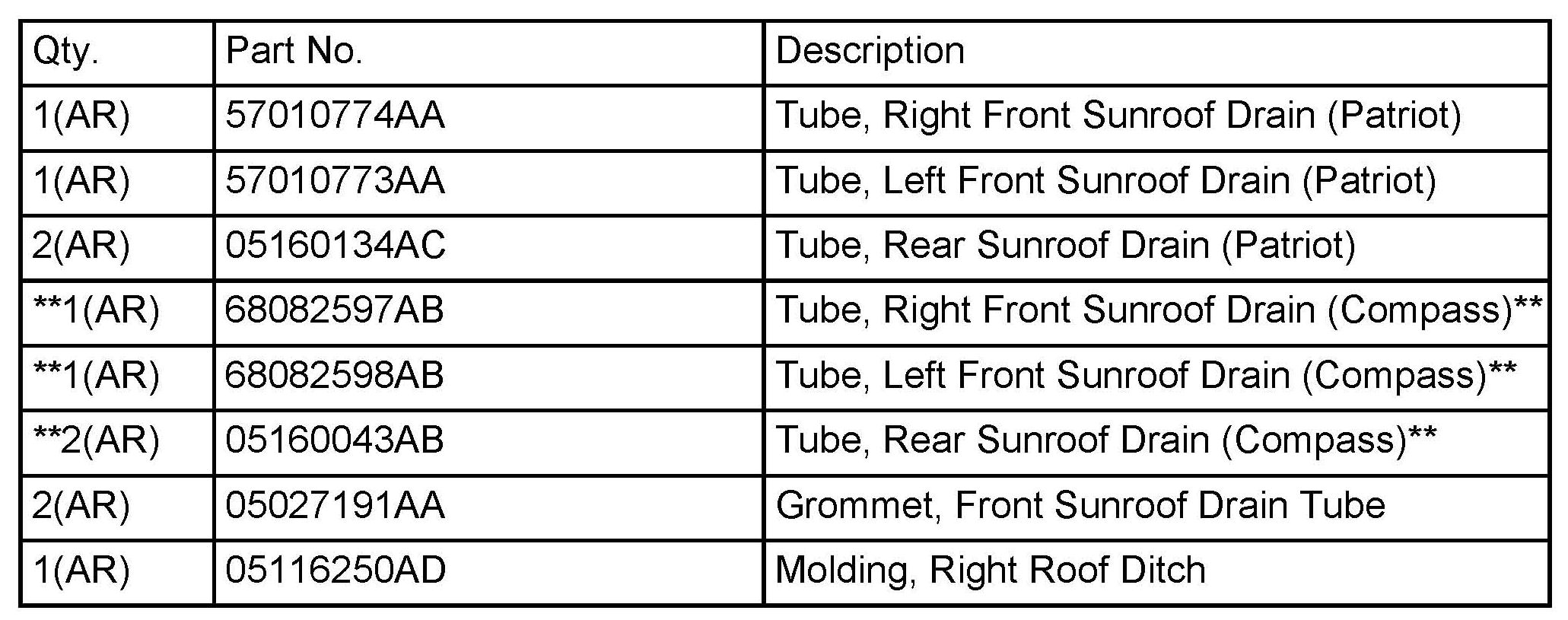 2. Install the new rear sunroof drain tubes. Refer to the detailed installation procedures available in DealerConnect > TechCONNECT under: Service info > Body > Sunroof > Tube, Sunroof Drain > installation.