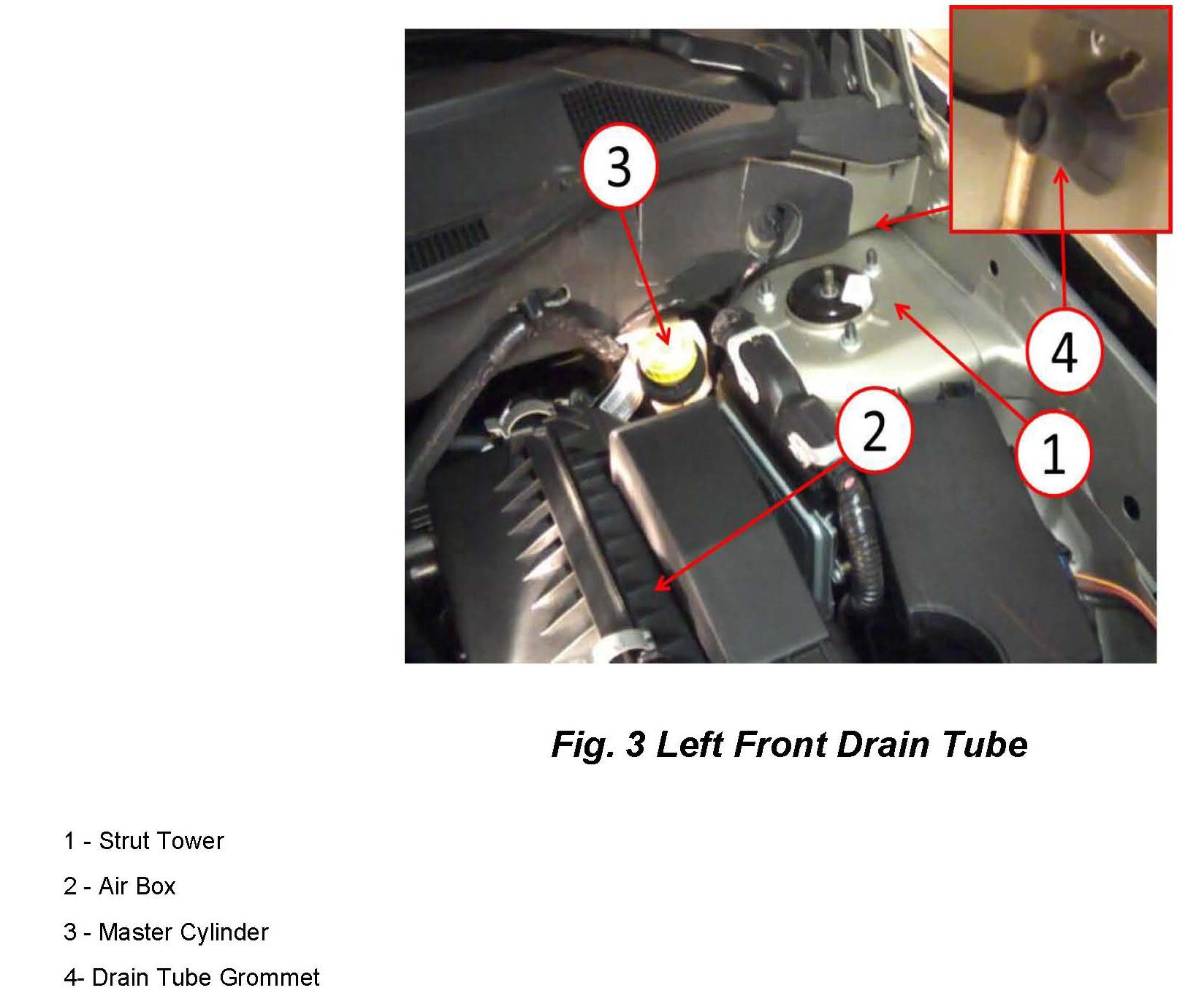 2. Remove the two nuts retaining the master cylinder to the brake booster and move it forward so the left front sunroof drain tube routing path can be accessed behind the left front strut tower (Fig. 2).