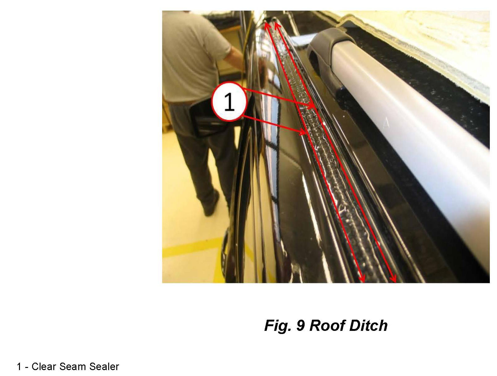3. Apply a clear paintable seam sealer such as Kent Hi-Tech Seam Sealer P10200 or equivalent along both sides of the roof ditch seam as shown in (Fig. 9).