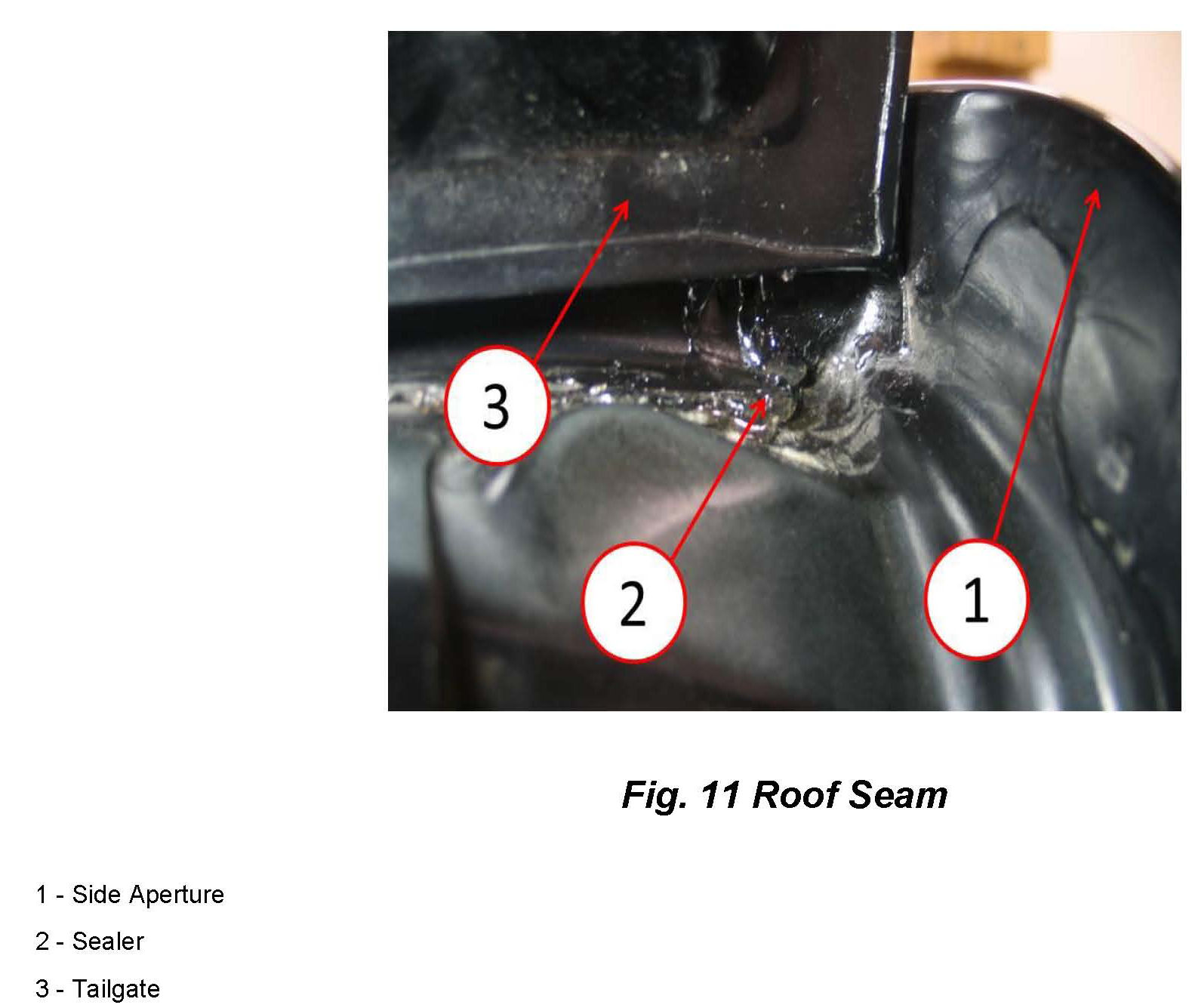 5. At the rear roof panel apply Kent Hi-Tech Seam Sealer P10200 or equivalent around the patch shown in (Fig. 11) on the right and left side.