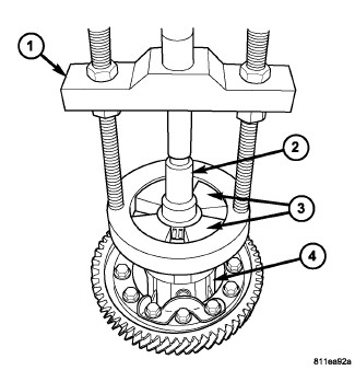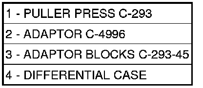1. Remove differential bearing cones (ring gear and differential case side) using Puller C-293 - PA (1), Adapter Blocks C-293-45 (3), and Adaptor C-4996 (2). If all wheel drive use Puller C-293 PA, four C-293-37 Inserts and Press Insert 9678 to remove the large carrier bearing.