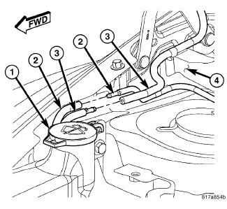 The front washer plumbing (3) consists of a small diameter rubber hose that is routed along with the rear washer plumbing (2) from the washer reservoir (1) located at the right front corner of the engine compartment. Both hoses are attached to their respective front or rear outlet nipple of the washer pump/motor unit near the bottom of the reservoir. The hoses are each then secured by a plastic push-in type retainer to the right side front end sheet metal within the engine compartment to the right side of the plenum panel (4). From the plenum panel, the two washer hoses are routed separately.