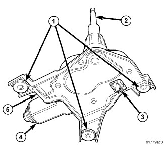 - Bracket (5) - The rear wiper motor bracket consists of a stamped metal mounting plate for the wiper motor that is secured to the wiper motor housing, and through three screws with rubber isolators (1) to the liftgate inner panel.