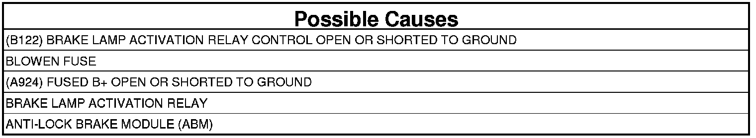 - Check for open Fuse, if okay repair open or short to ground in the (A924) Fused B+ Circuit or short to ground in (B122) Brake Lamp Activation Relay Control circuit.