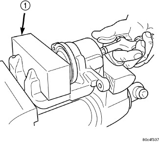 2. Place a wooden block (1) in the caliper as shown.