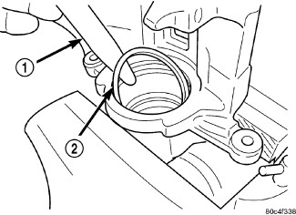 6. Using a soft tool such as a plastic trim stick (1), work the piston seal (2) out of its groove in caliper piston bore. Discard the used seal.