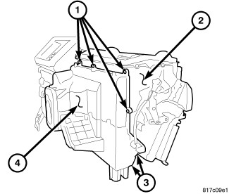 1. Position the air distribution housing (2) onto the rear of the HVAC housing (4).