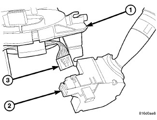 8. Disconnect the electrical connectors (2) between the SCCM (1) and the instrument panel wiring harness at the base of the SCCM and remove from column.